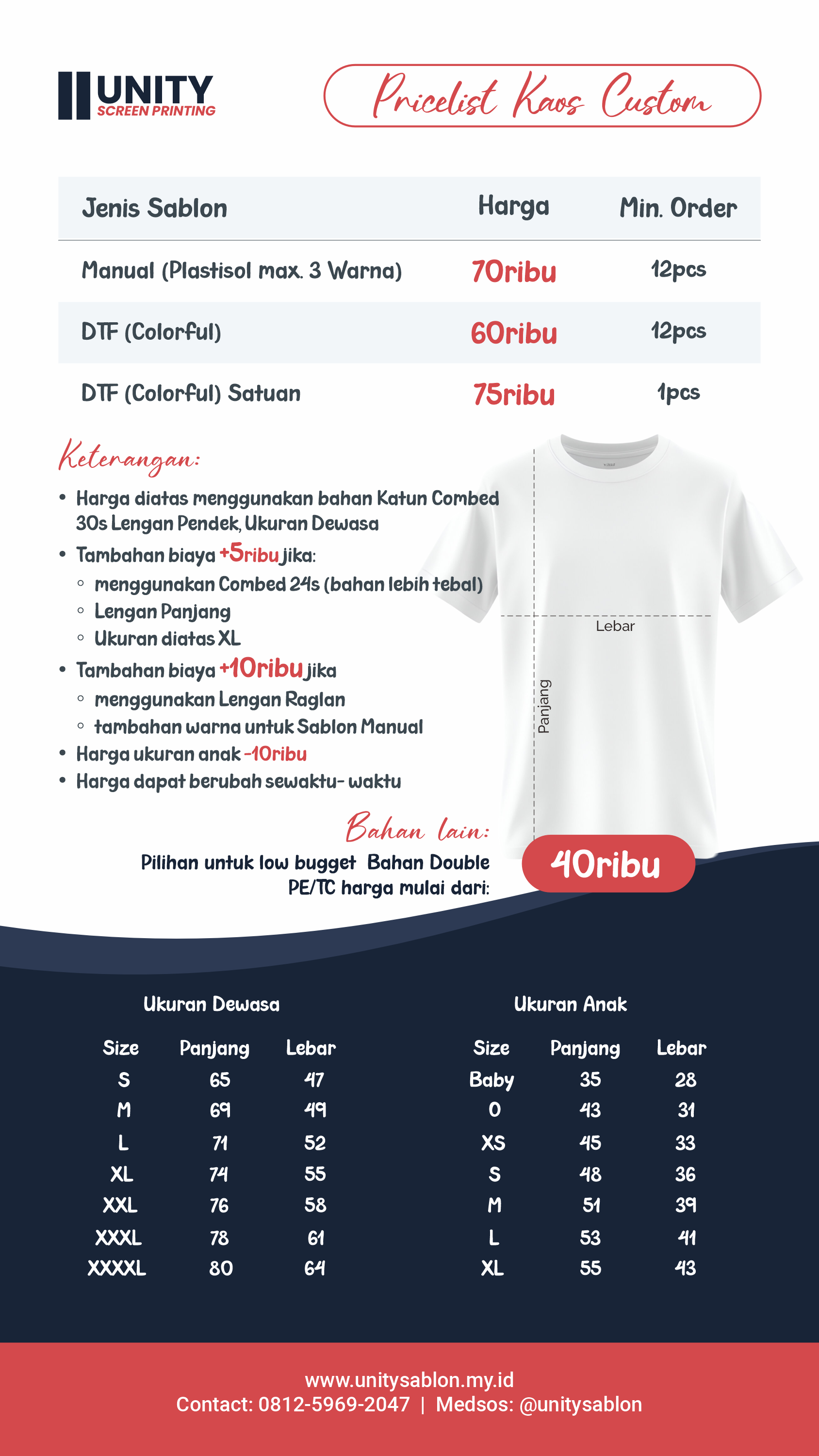 Kualitas tinggi dengan material plastisol berkualitas. Maksimal 3 warna dengan hasil yang tahan lama. Cocok untuk komunitas dan event (min. 12 pcs).